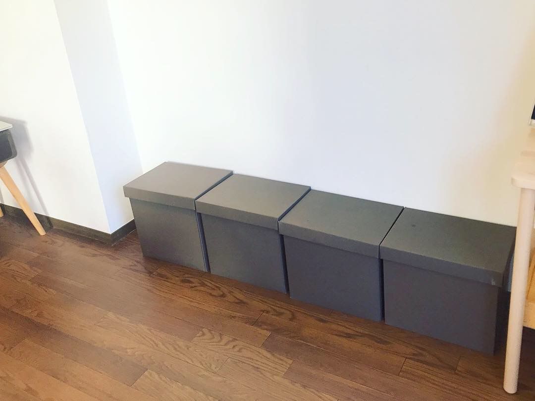 無印のフタ式ダンボールボックスの、グレーとも茶色ともつかない落ち着いた微妙な色合いが床に馴染むので好きです。
