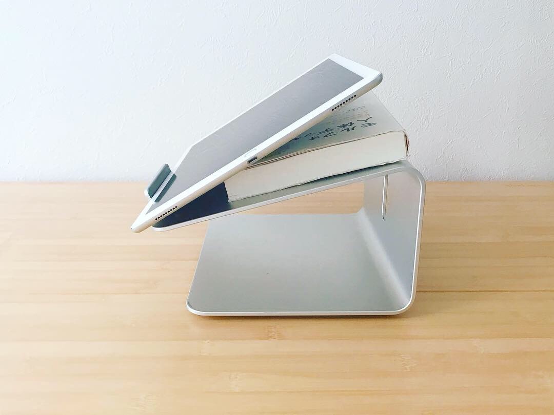 ただこのスタンドには角度調節機能がないので、こんな風にiPadとスタンドの間に本や空き箱を挟んで調節していました。 でもこの方法だと、角度をつけすぎるとiPadがずるっと滑り落ちてくるんですよね。それをキャッチしてことなきを得てきましたが、割と頻繁に起こります。2日に1回くらいの頻度でキャッチしてきました。(危険)