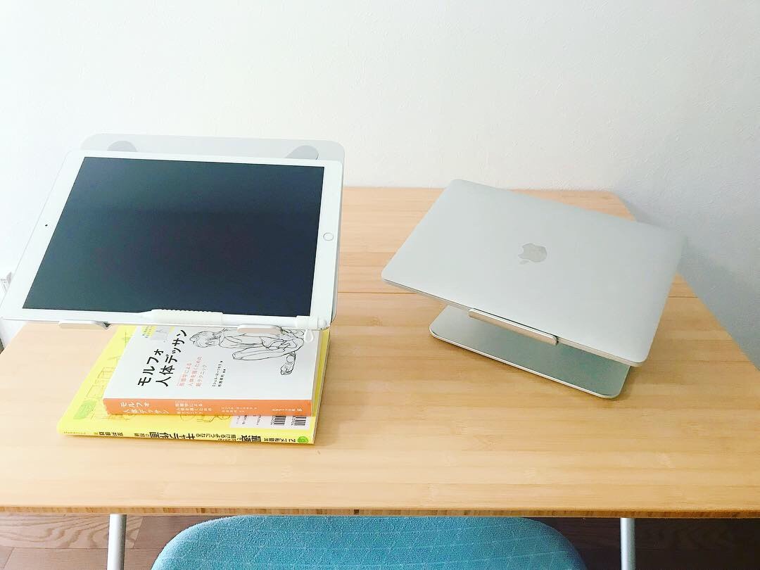BoYataのスタンドにiPad Proを置き、これまでiPadスタンドとして使っていたものにMacBookをのせています。