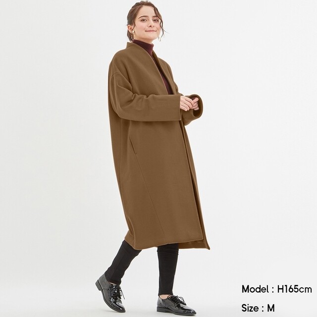 GUのフリース混のノーカラーコートが3,990円でありながらシルエットが綺麗で、ものすごくコスパがいいなと思い、店頭で試してみました。