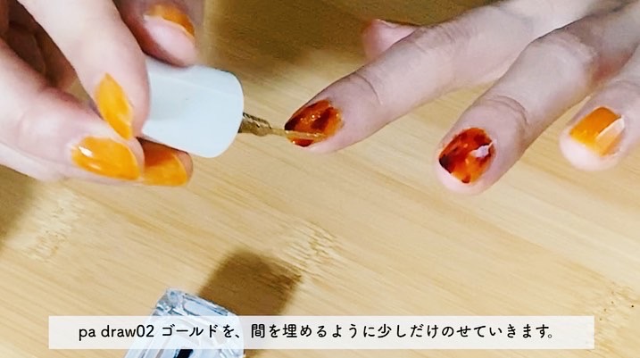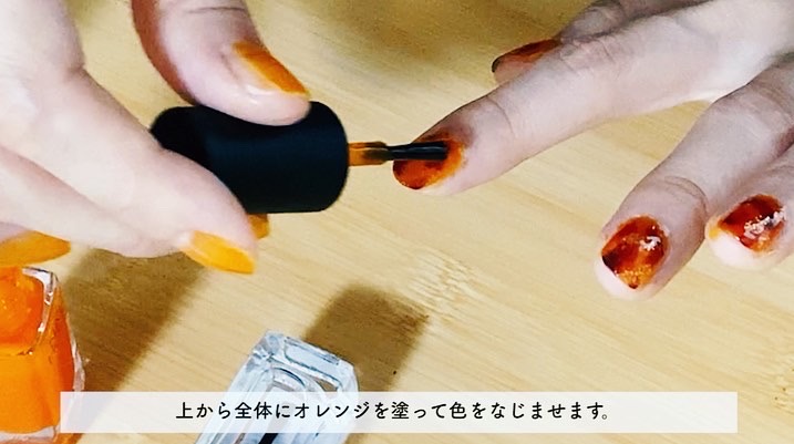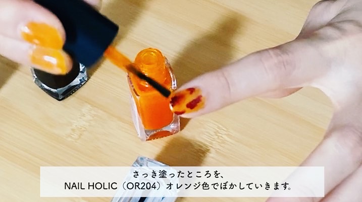 4.さっき塗ったところを、NAIL HOLIC(OR204)オレンジ色でぼかしていきます。
