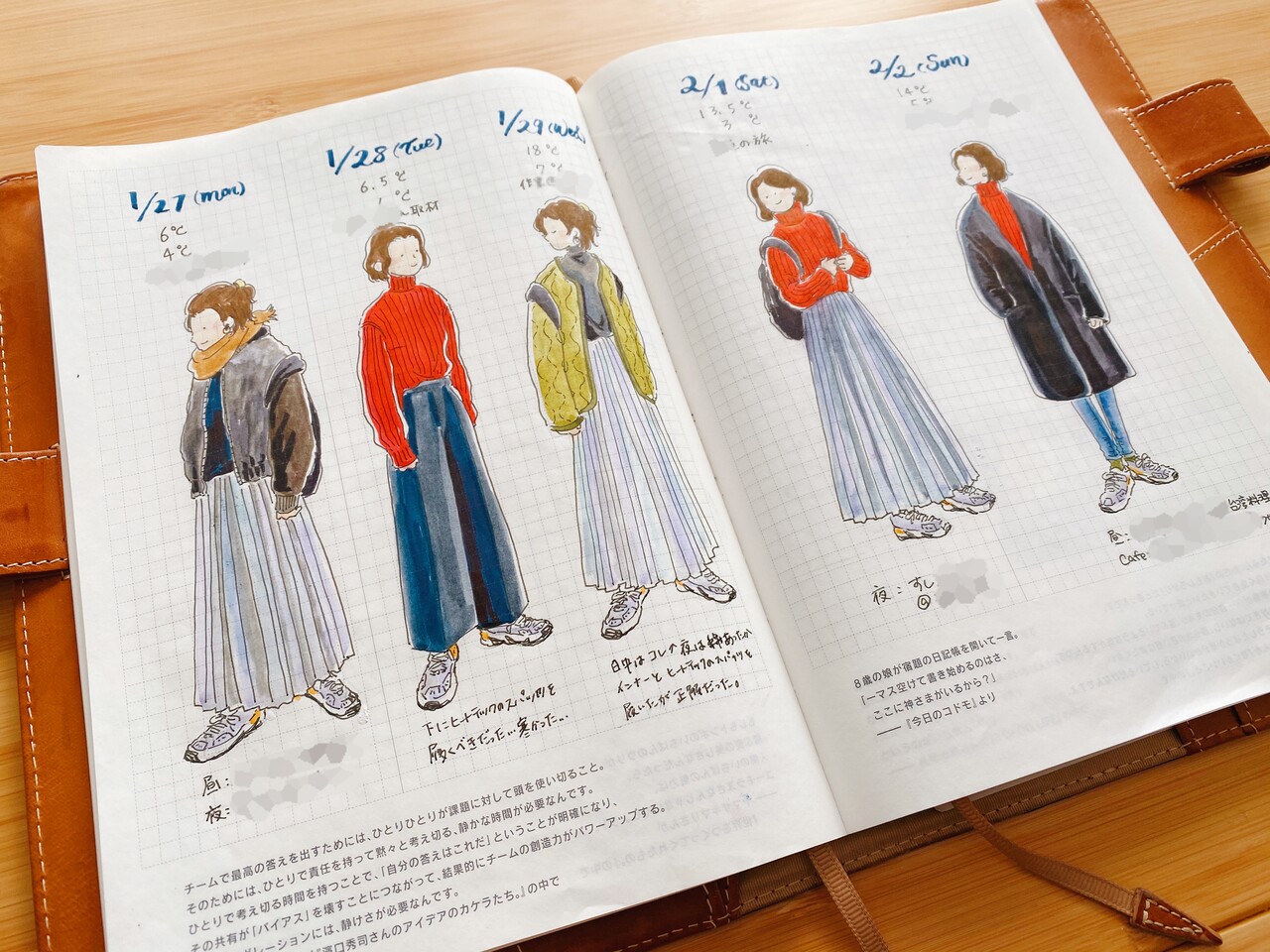 一週間で外出した日の服装と気温、行ったお店を書きつけておくという「着た服メモ」、