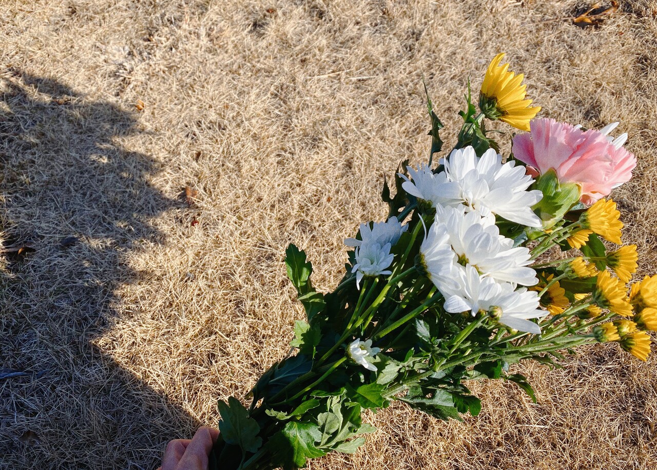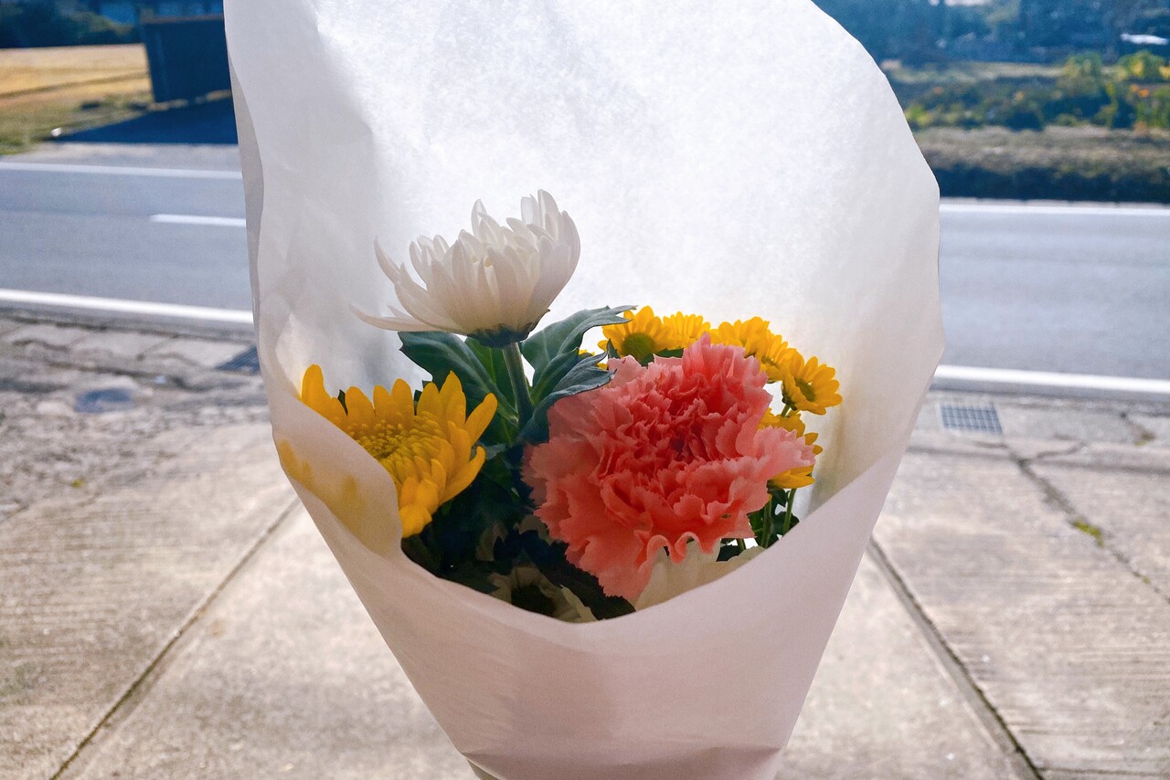 どこかのスーパーでお花を買えるだろうと思っていたら全然スーパーがなくて、霊園から数キロ離れたところにある商店を見つけ、切り花を買うことができました。