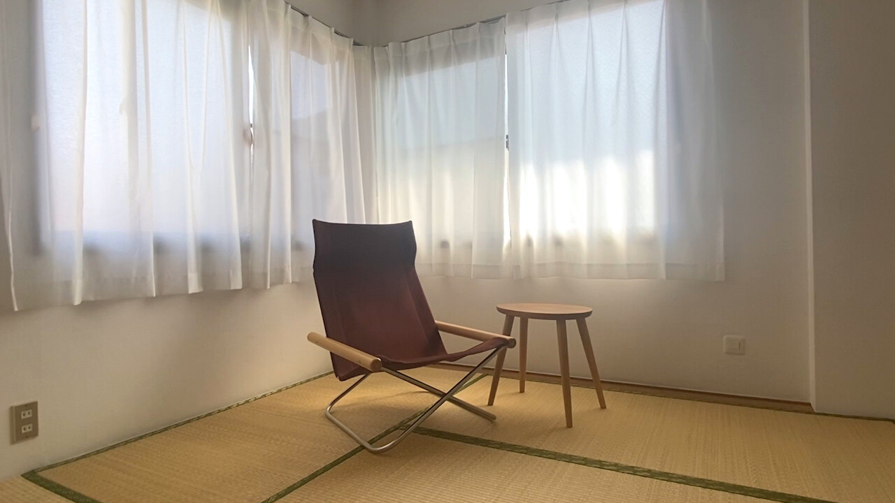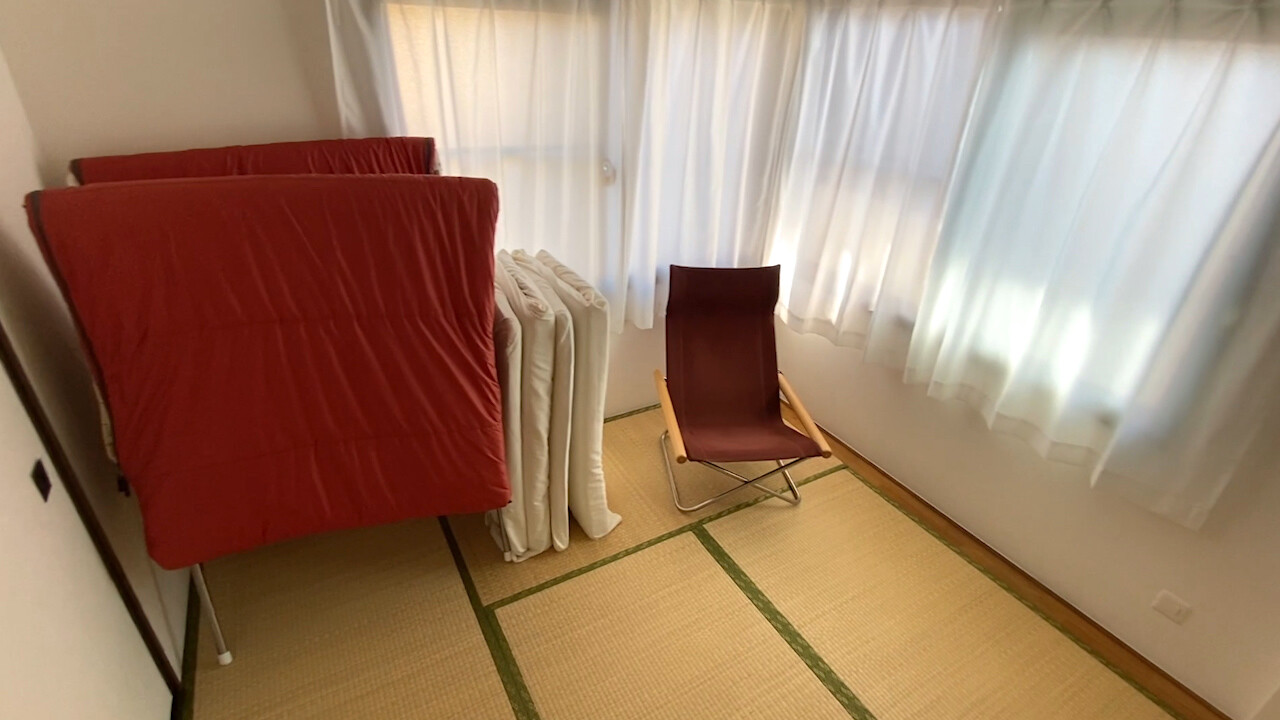 布団干しスタンドと折りたたみの椅子があり、押入れがあります。