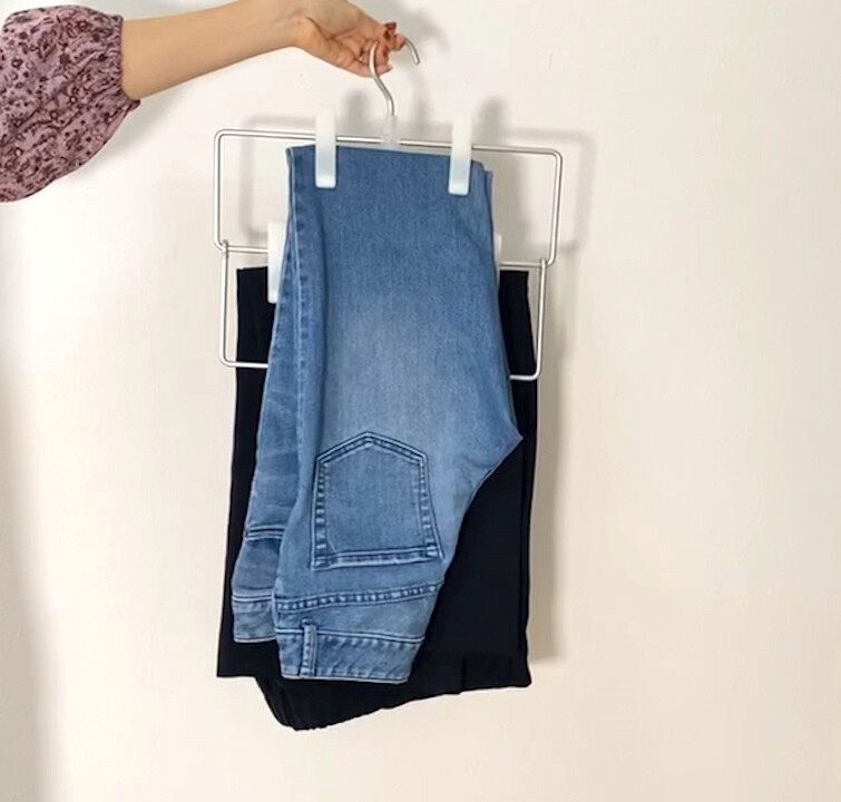 丈の長い服を掛ける時も、ハンガー2本を使ってS字になるように掛ければ、裾が棚板に擦れないように吊るせます。