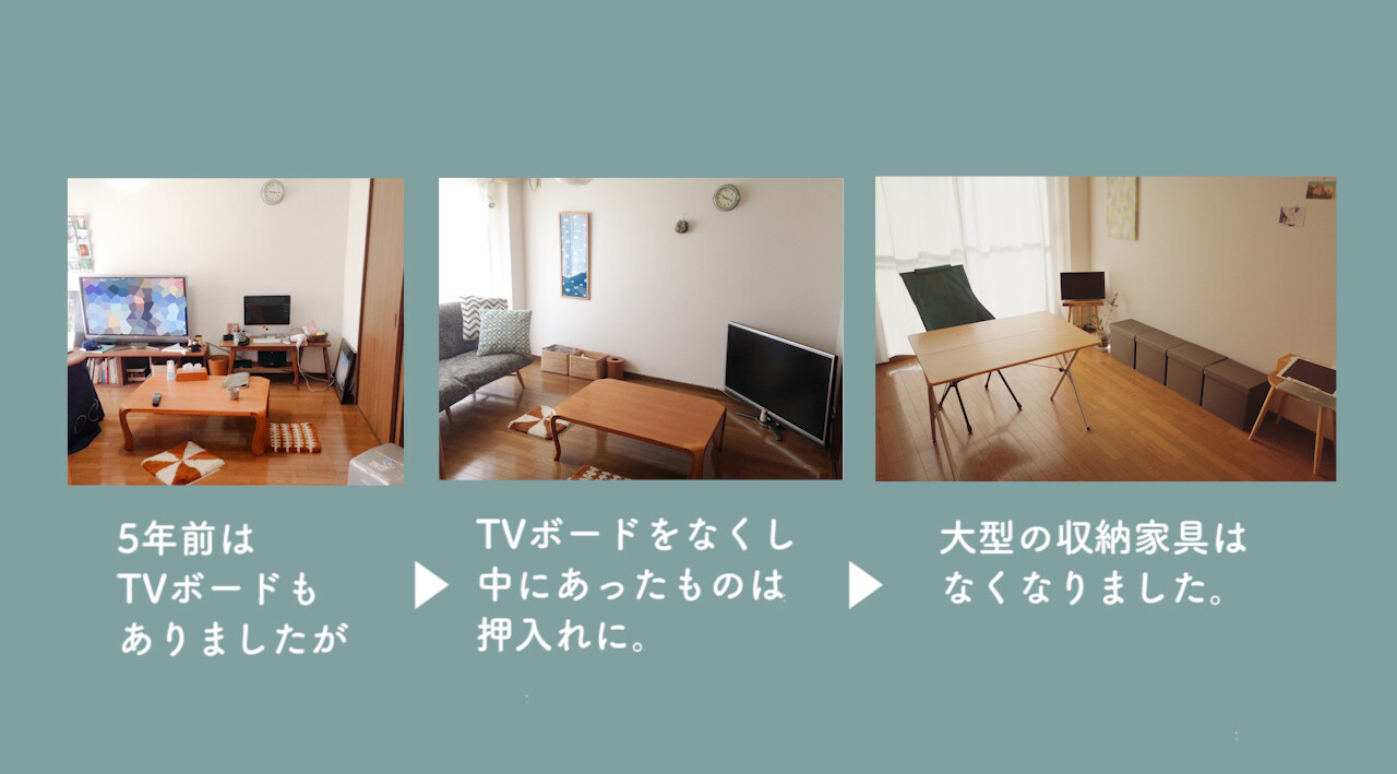 同じく5年前はTVボードもありましたが、中身を減らしつつ押入れに。