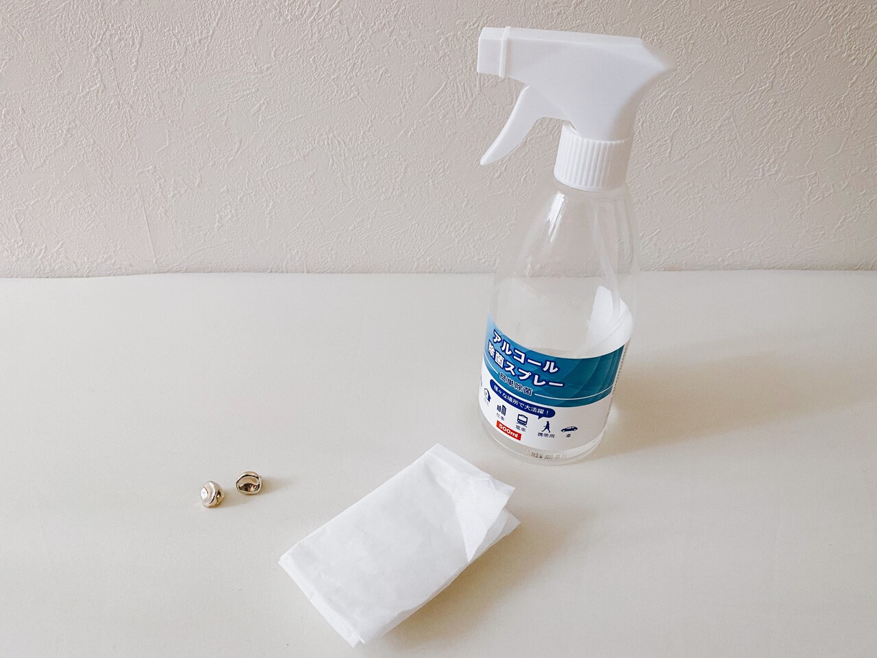 ティッシュにアルコールを吹きかけて、アクセサリーを拭いています。