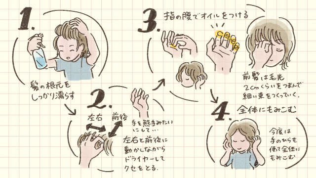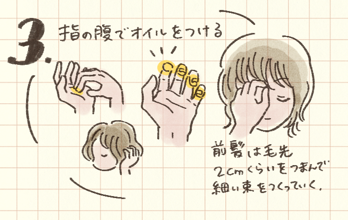 3.ヘアオイルを指の腹で髪に塗布する