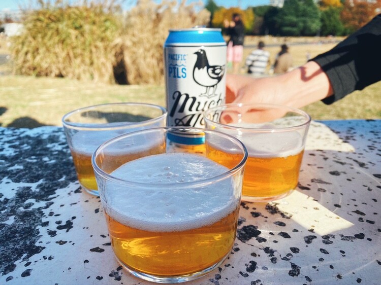 公園でビールを注いで飲んだ時の写真です。