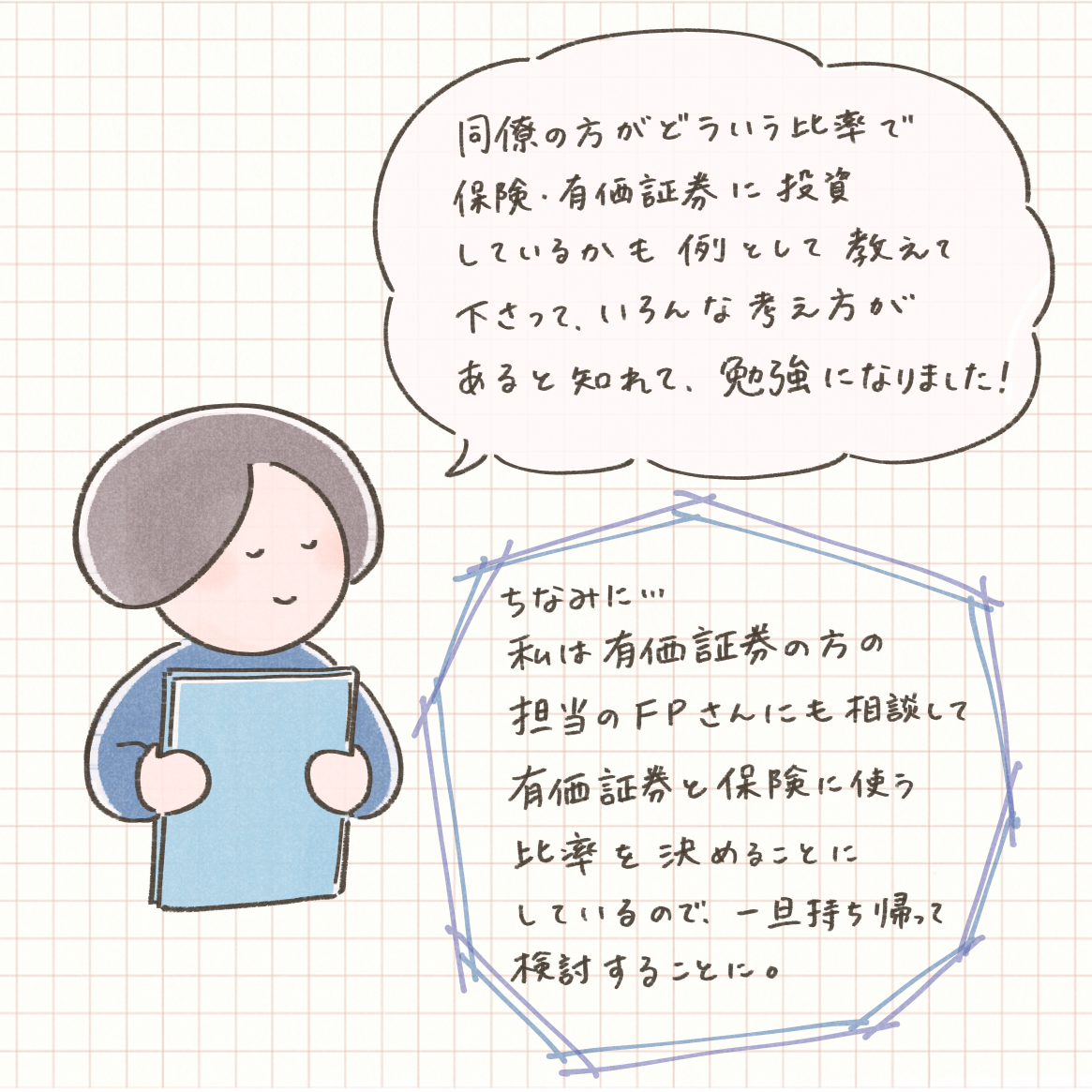 わたしは以前から有価証券を買っていて、そちらのFPさんに相談して有価証券と保険の比率を決めようと思い、一旦持ち帰って検討することにしました。