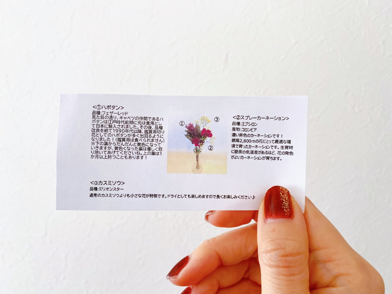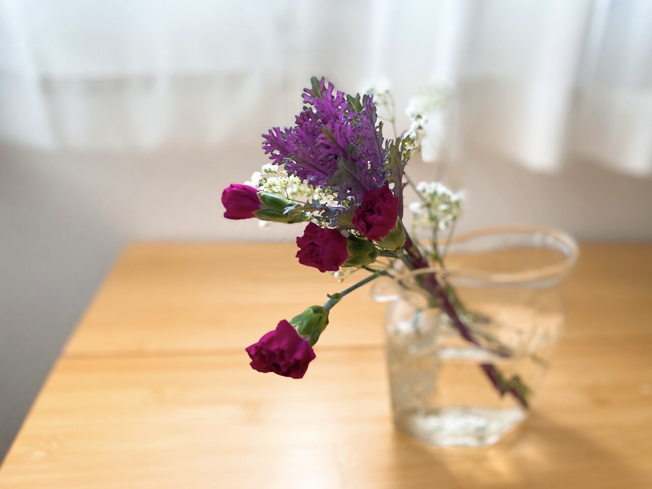 今回は、ハボタン、スプレーカーネーション、カスミソウが入っていました。