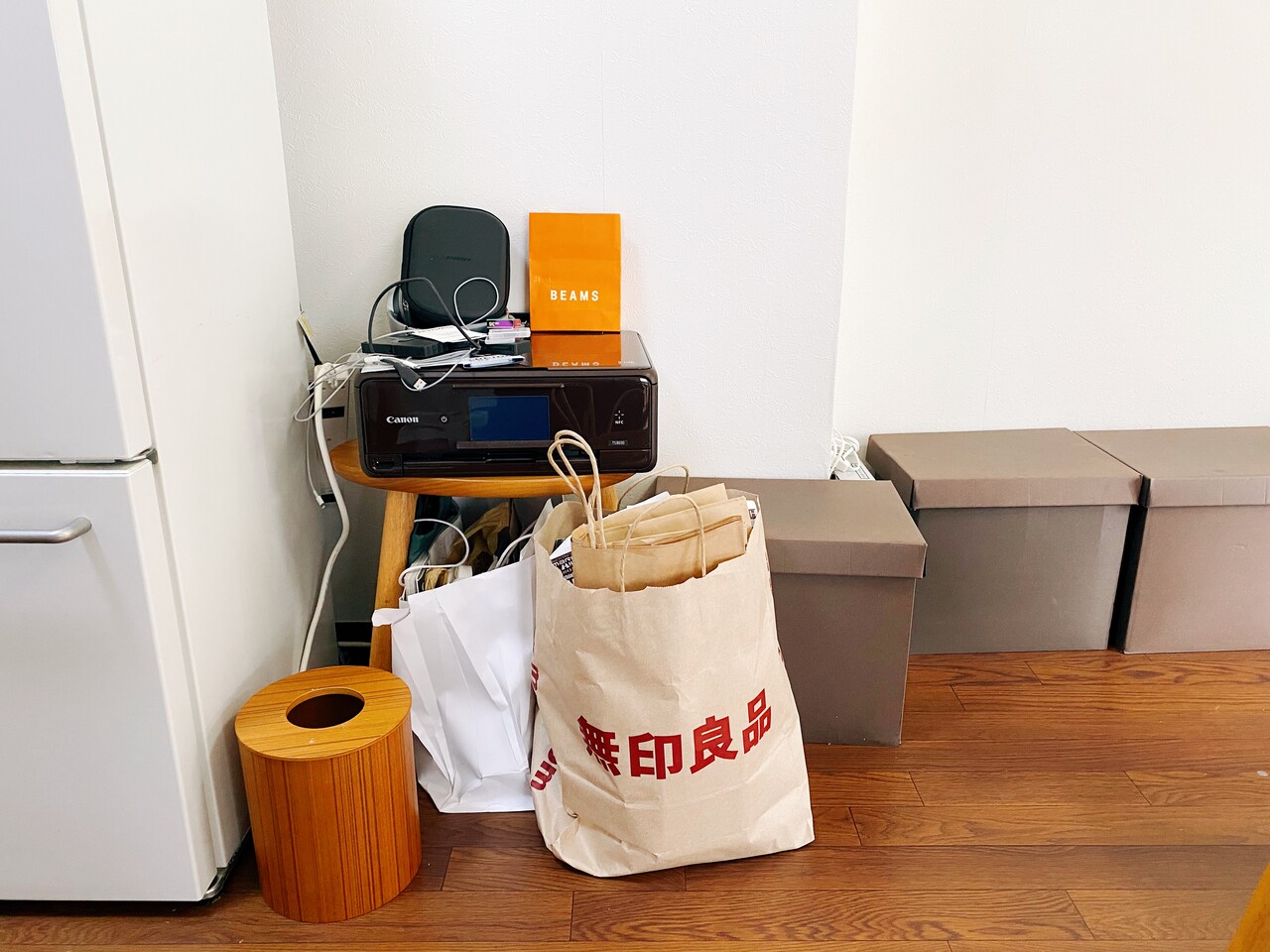 最近は紙袋にまとめて一時置きしているのですが、その紙袋がどんどん増えてきていて、こんな感じになってます。リビング。