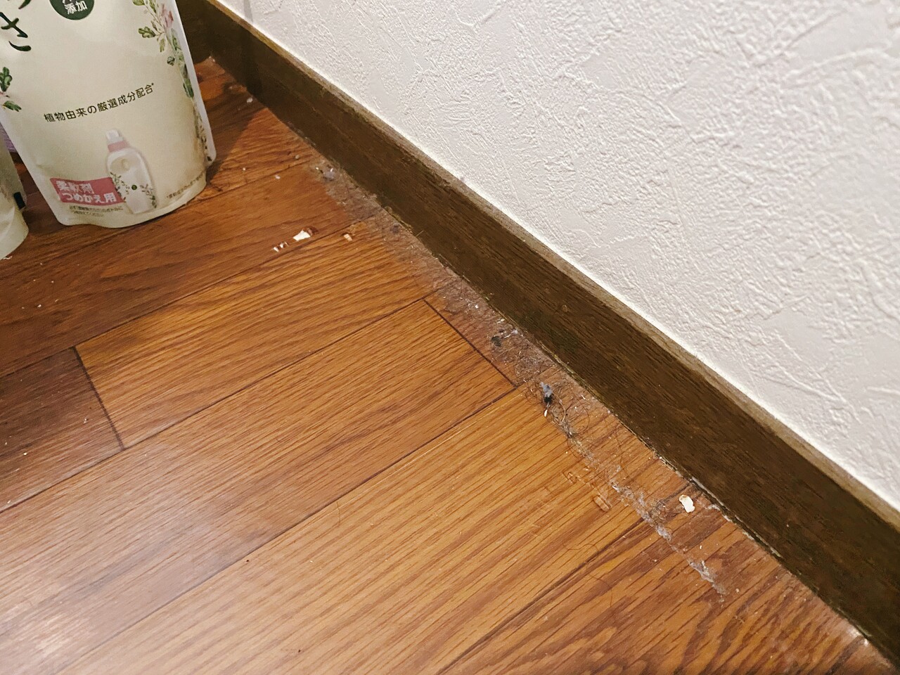 脱衣所横の収納ケースをどかしてみたら、ショックなくらい床にゴミが…