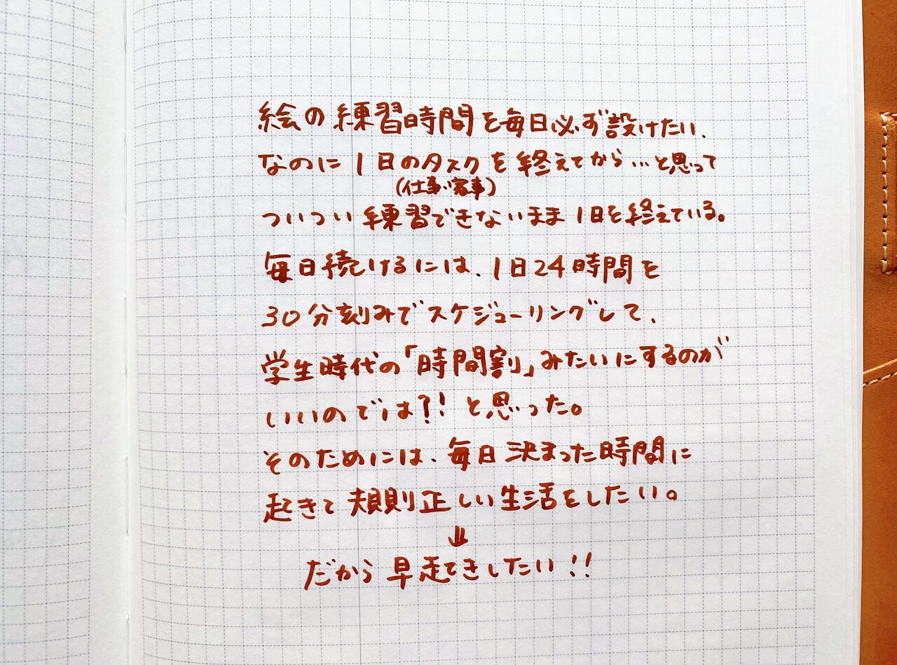 24時間を30分刻みでスケジュールを立てて、この30分は文章を書く作業時間、この30分はお風呂、21時〜22時は絵の練習、という風に、