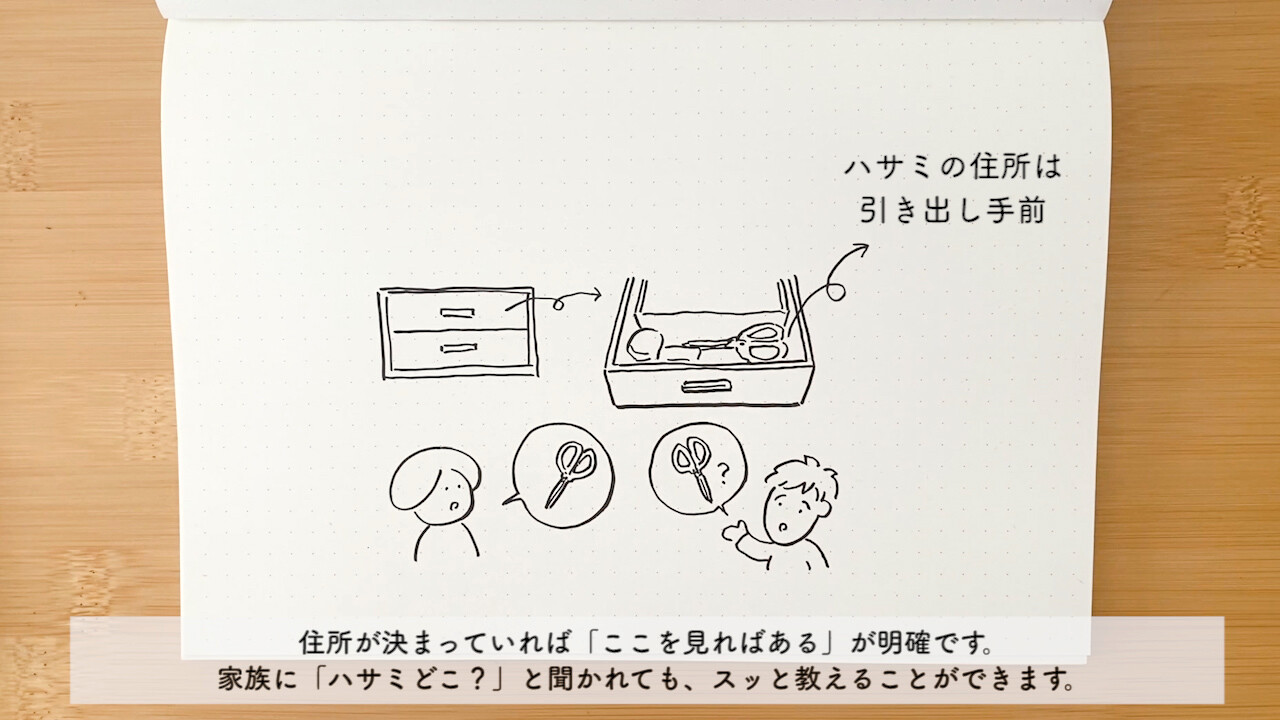 例えばハサミを使いたいとして、住所が決まっていれば「ここを見ればある」が明確です。