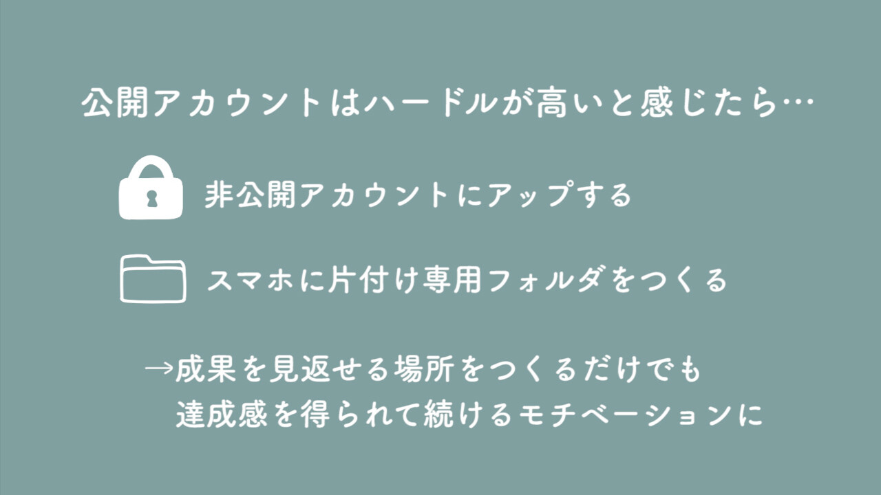 例えば鍵をかけて非公開アカウントにあげてもいいと思いますし、スマホに片付け専用のフォルダを作ってそこに画像を入れていってもいいと思います。