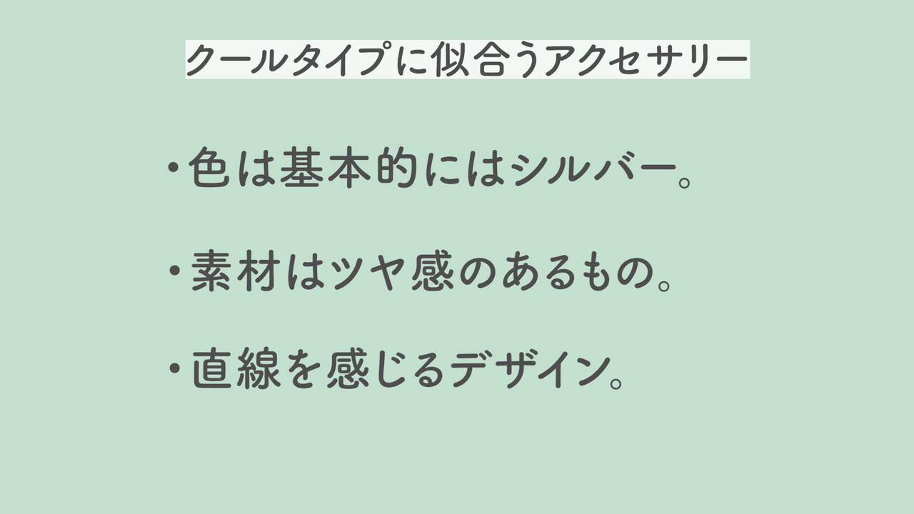 そして今回aoiさんにクール・クールカジュアルタイプに似合うアクセサリーを持ってきてもらいました。 1.基本的にシルバー