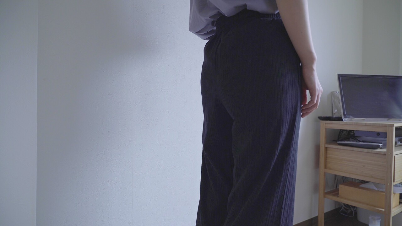 具体的には、部屋着として長時間着ていられる肩周りのゆったり感と、ウエストがゴムであることが必須です。