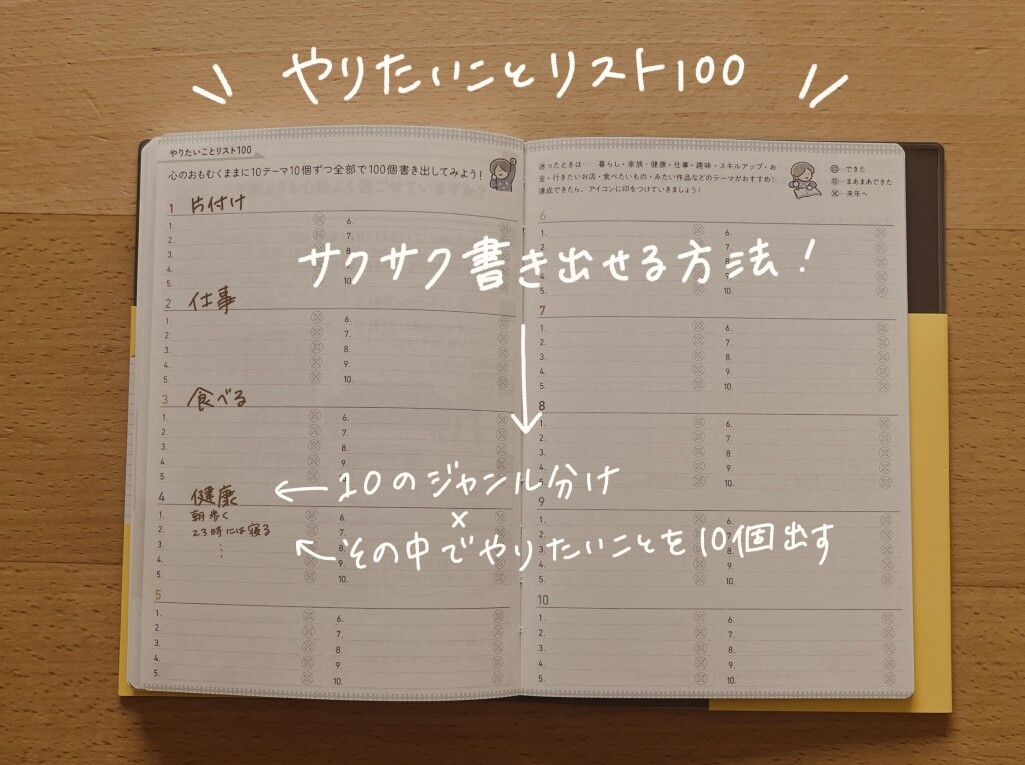 10のジャンルに分けて、その中でささいなことでもやりたいことを10個書き出すと、案外サクサク書き上げられます。