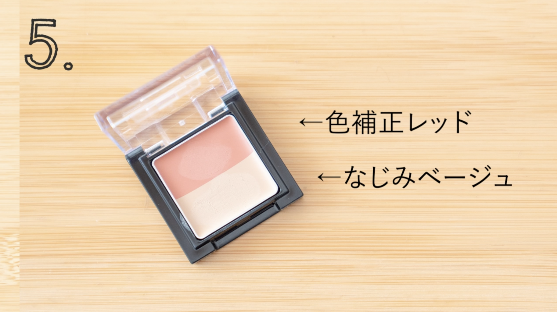 この「色補正レッド」の方でクマの青さを隠してから、「なじみベージュ」を重ねると綺麗にクマが消えます。