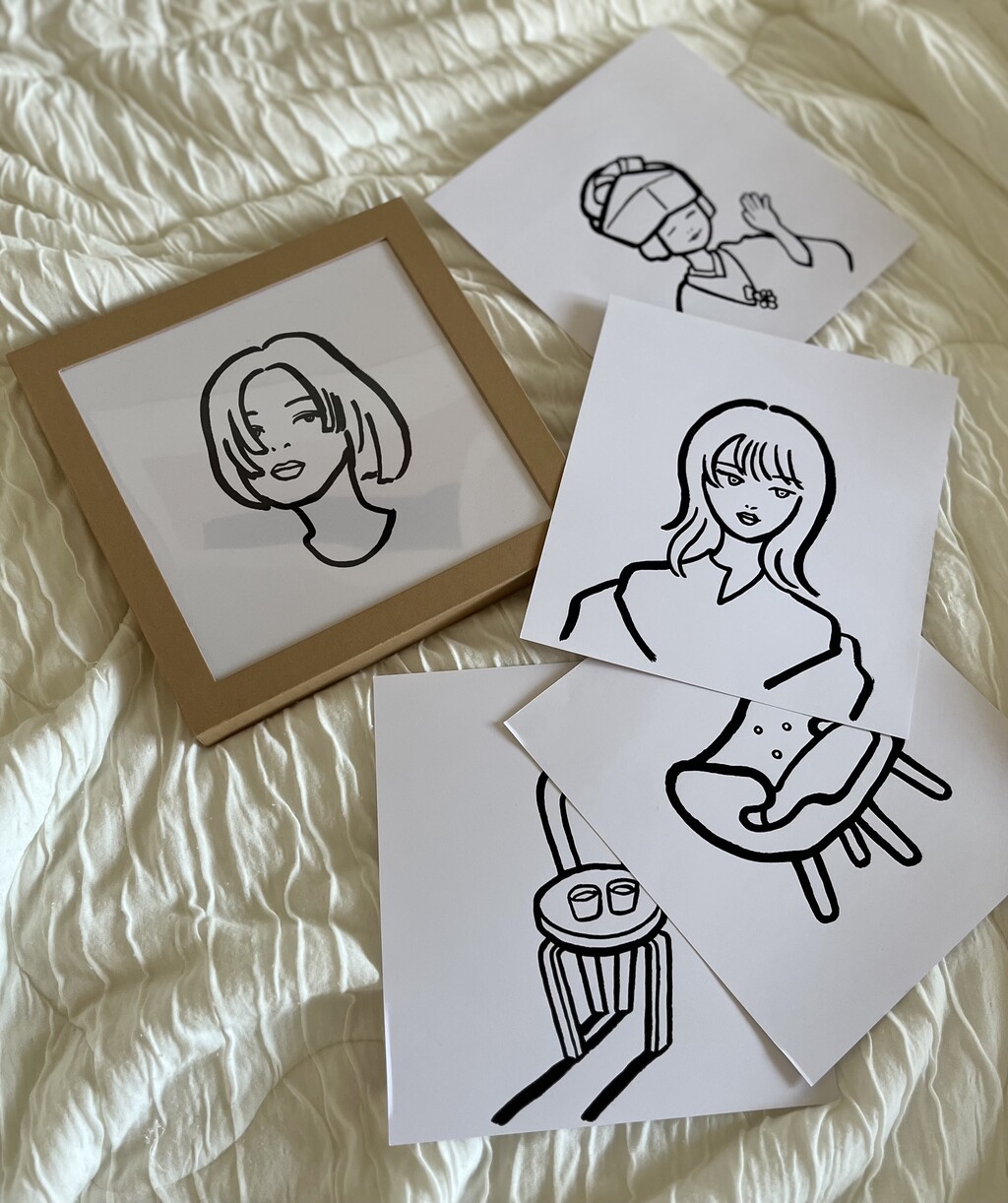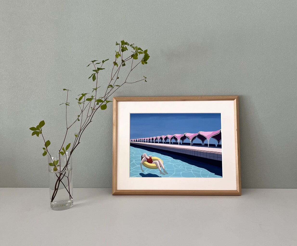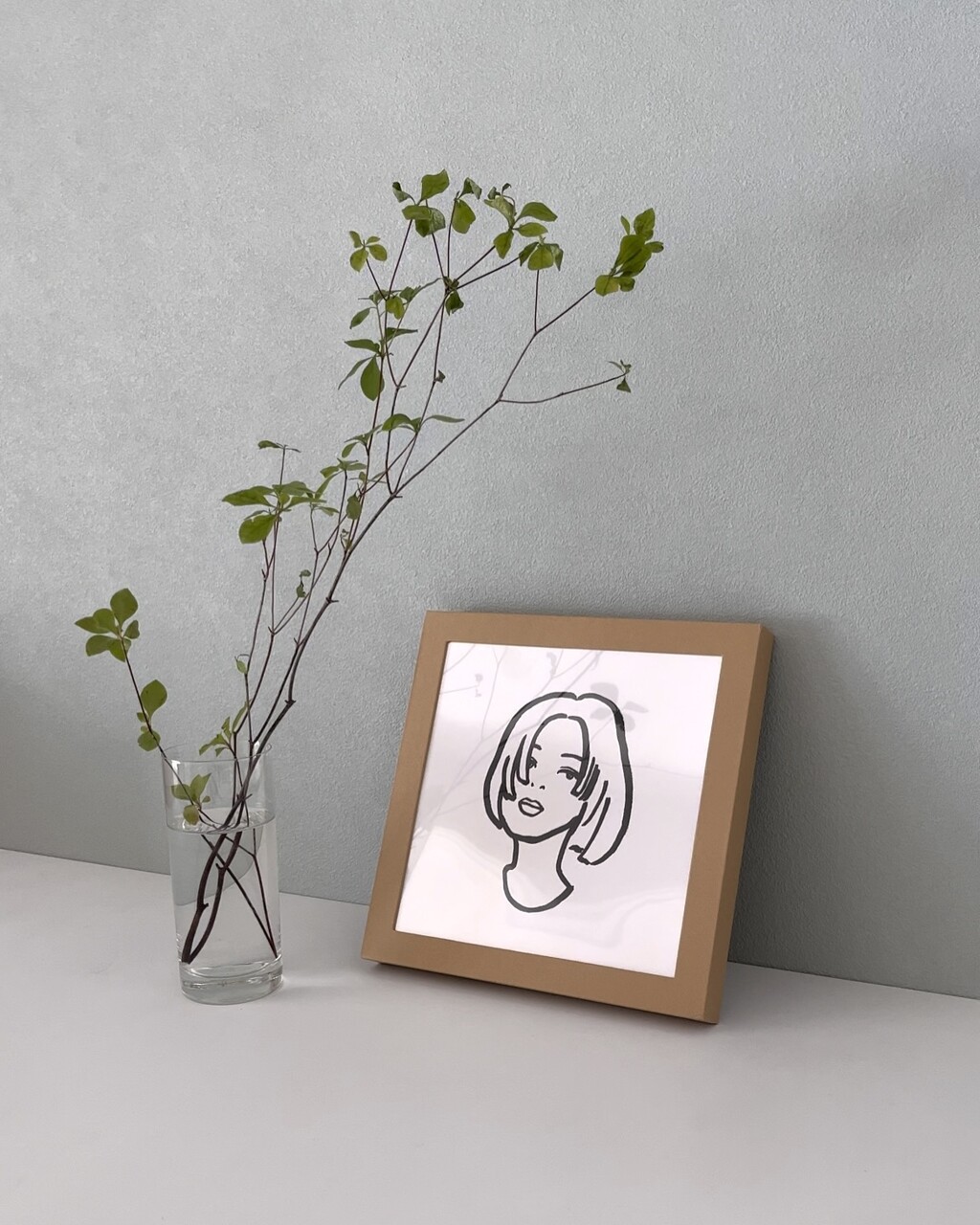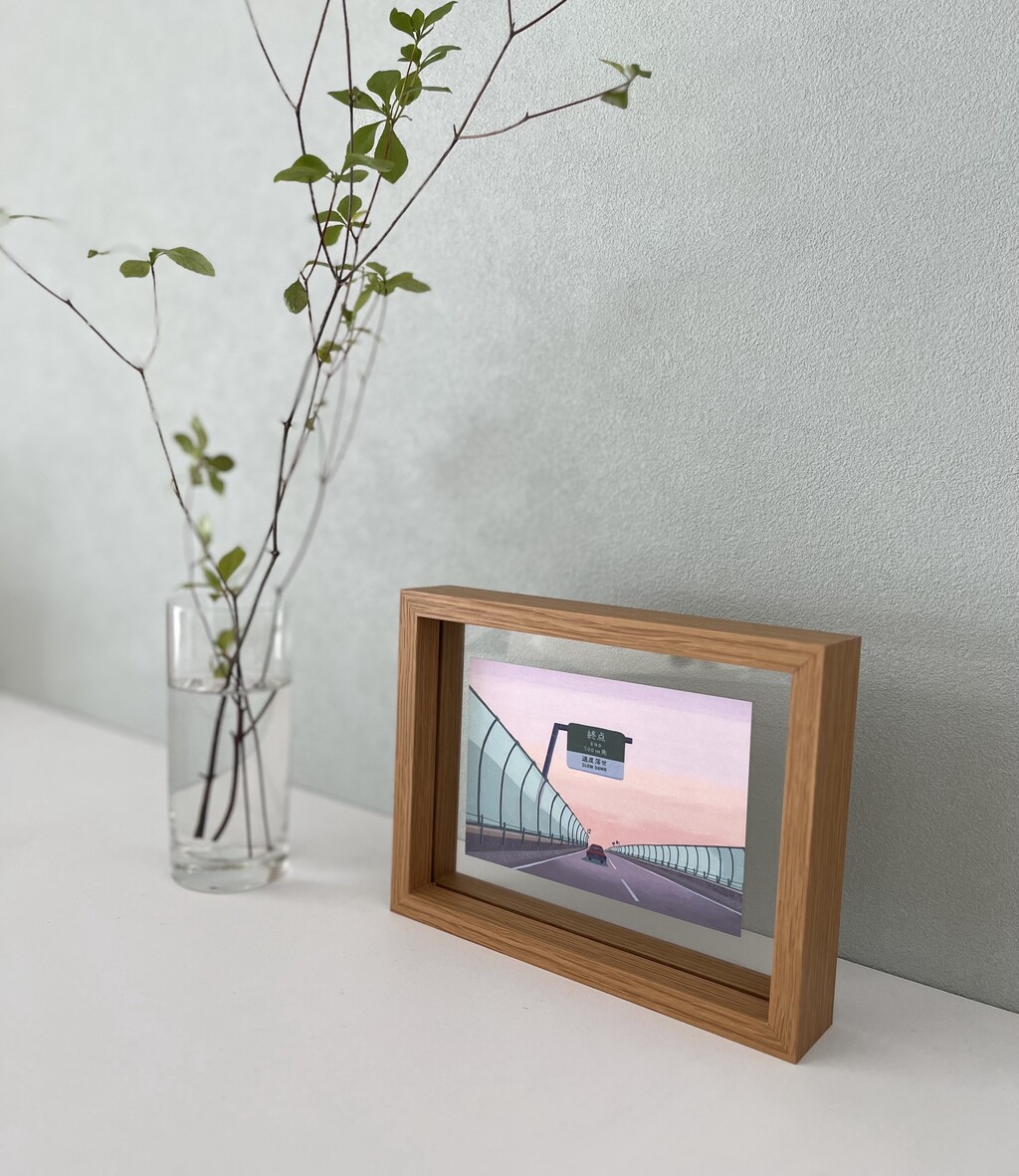 ナチュラルな木製のフレームに額装したジークレープリントのイラスト作品。
