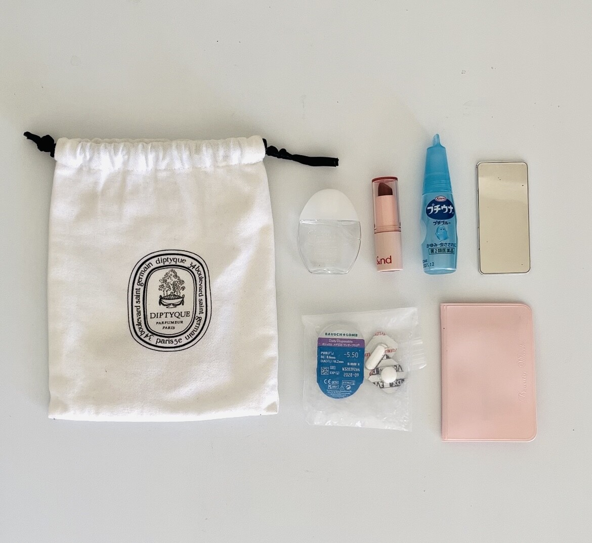 目薬、リップ、プチウナ、缶ミラー、コンタクト(落とした時のために片目分)と薬、おしろいつき脂取り紙