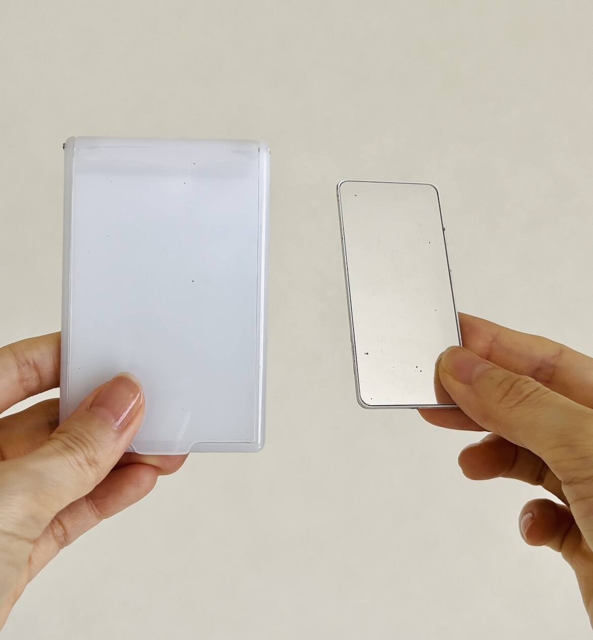 左がセリアの折り畳みミラー、右が缶ミラー。