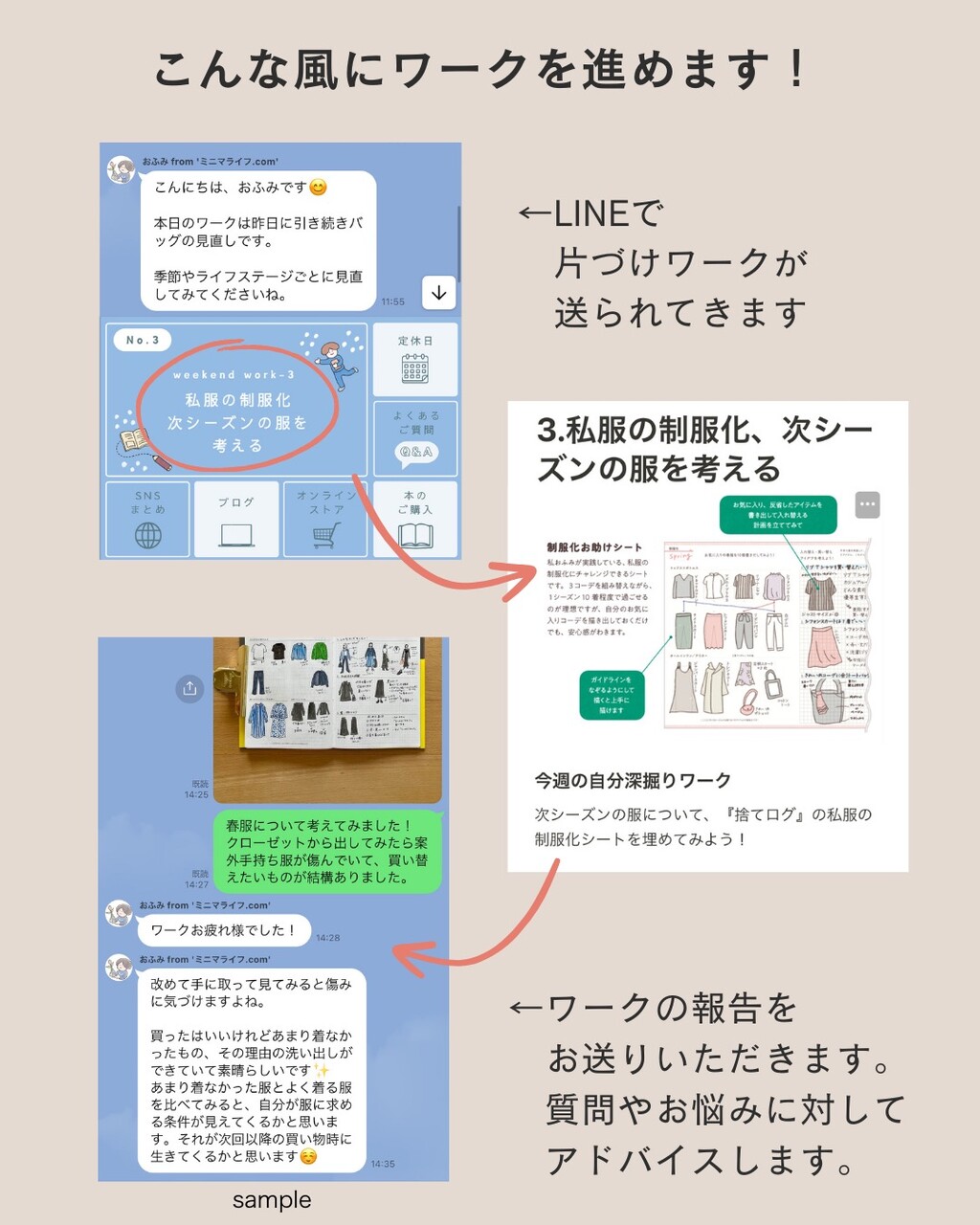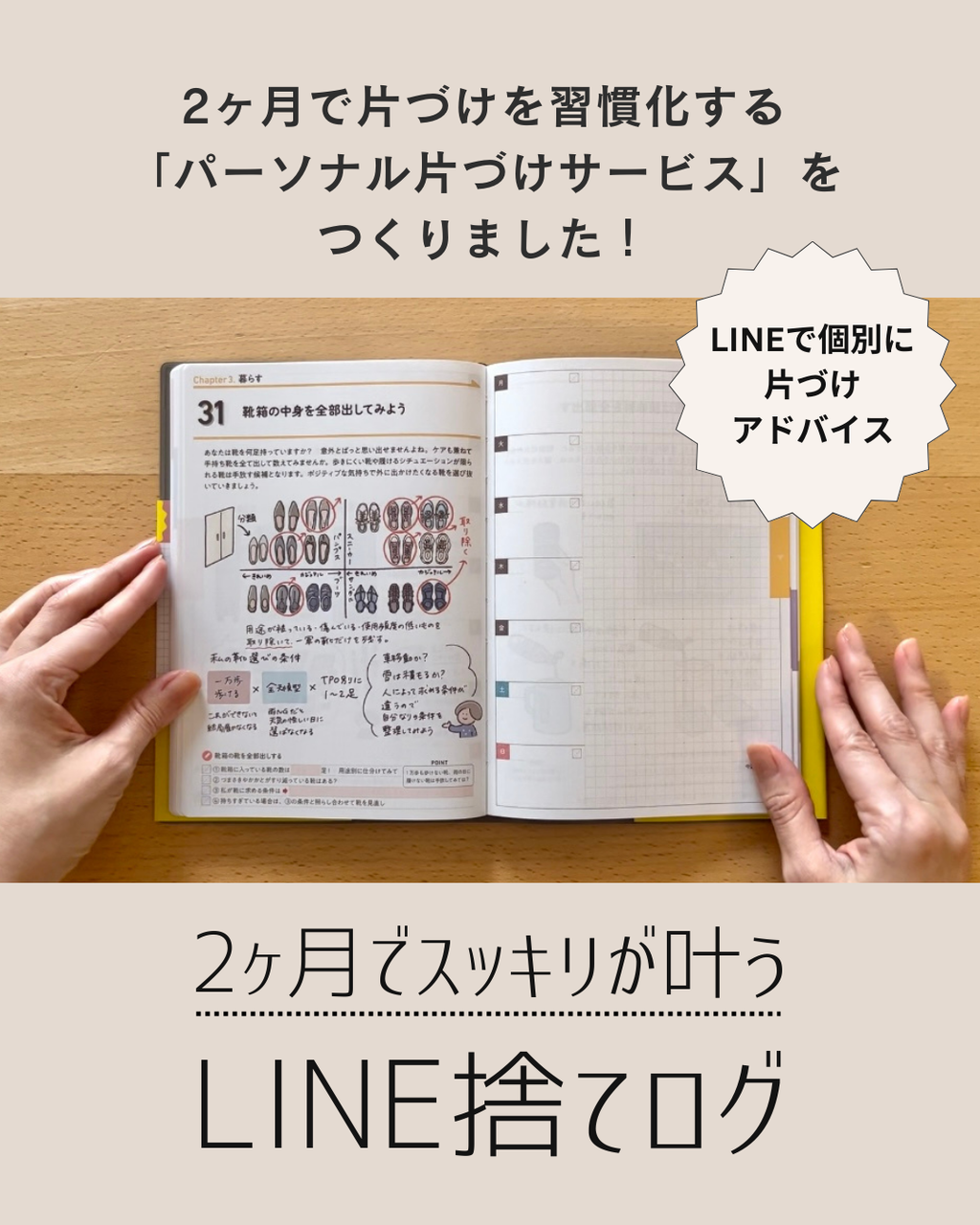 片づけ手帳『おふみさんの捨てログ』をテキストに、LINEで片づけワークが届きます。