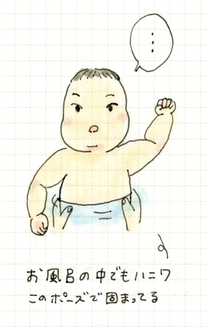 普段、喃語を話しているのですが埴輪ポーズで入浴中はいつも無言。でもとても物言いたげな顔。